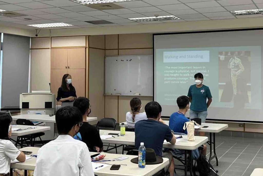 我們經過一連串的演練,包括接待來賓時如何給人好的第一印象、站姿、坐姿等,也實際上台練習與人對話的語調和儀態。